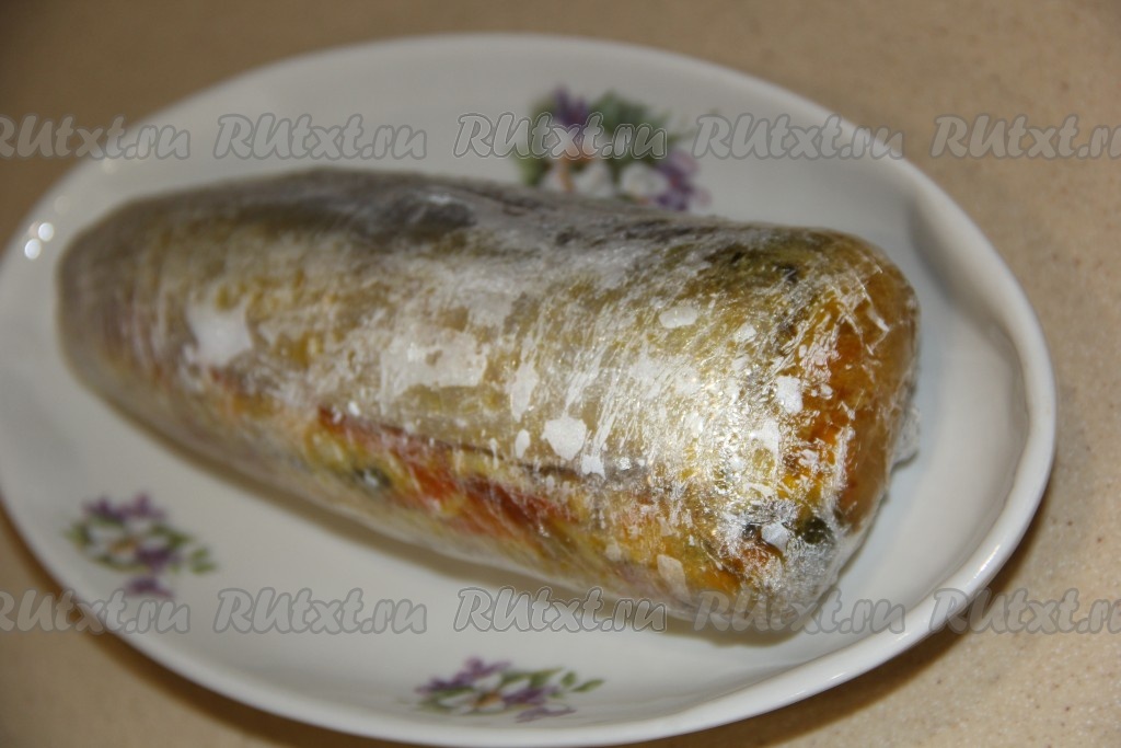 Сложить филе скумбрии с начинкой пополам так, чтобы начинка была внутри и плотно замотать в пищевую плёнку в несколько слоёв.