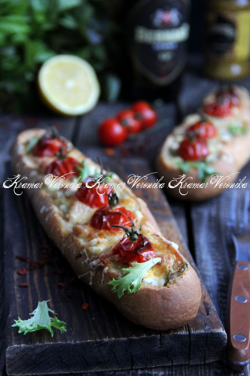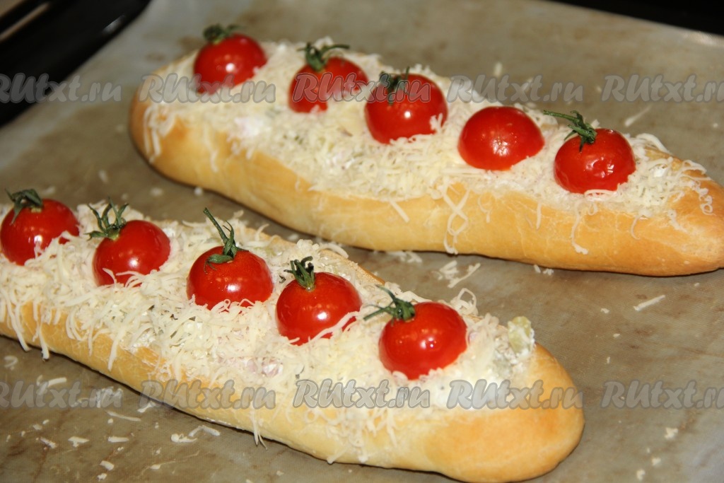 Переложить багеты на противень, застеленный пергаментом (или тефлоновым ковриком). Поверх сыра выложить половинки помидоров черри.