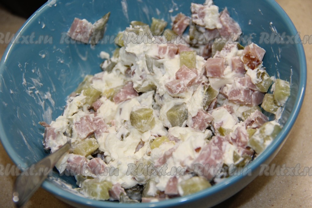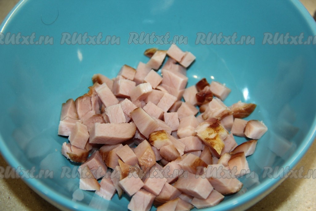 Ветчину нарезать на мелкие кубики.