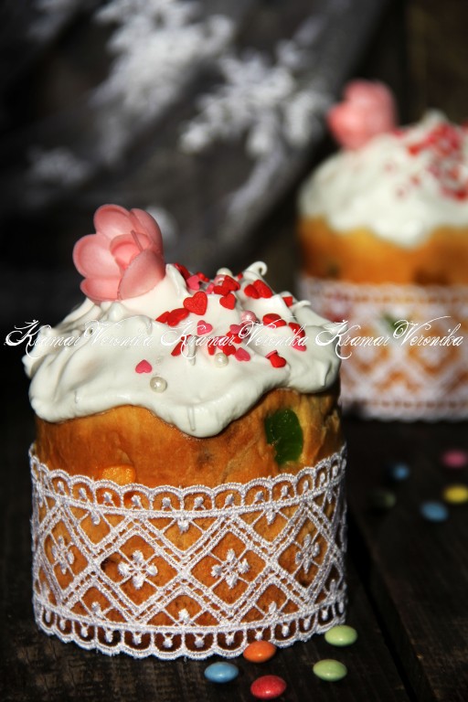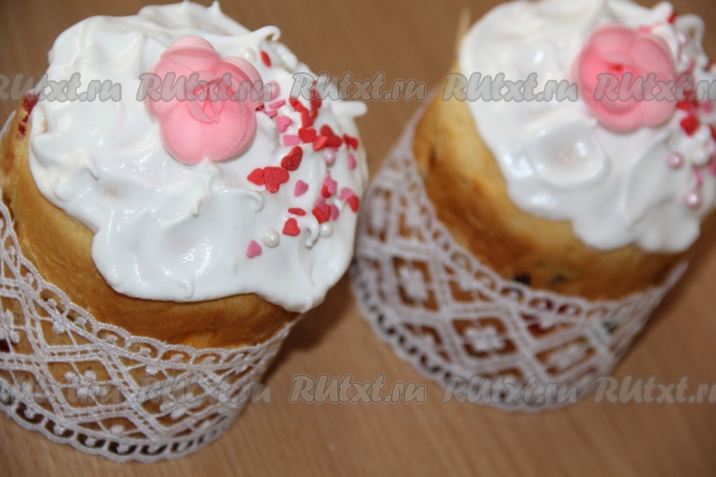 Покрыть остывшие куличи белковой глазурью и украсить цветной посыпкой.