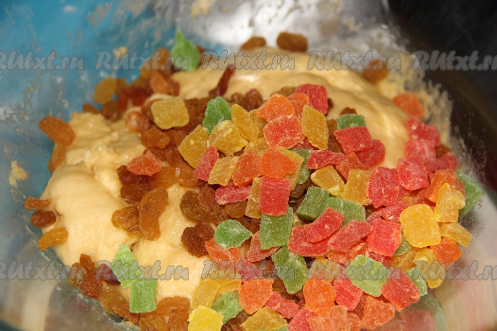 Подошедшее тесто для куличей, замешанное в хлебопечке, переложить в миску. Добавить к тесту (замешанному вручную или в хлебопечке) цукаты и изюм.