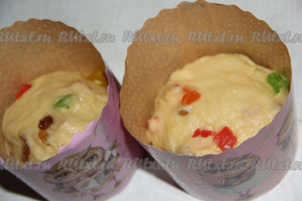 Аккуратно вмесить сухофрукты в тесто. Разделить тесто на части и разложить по формам для куличей. Я использую бумажные формы для выпечки куличей. Формы заполнять на 1/2 объёма.