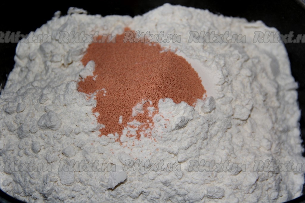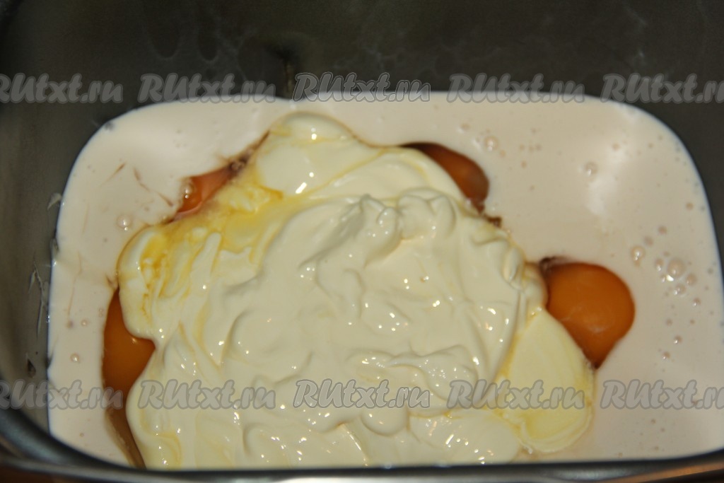 Я для замеса теста использовала хлебопечку, но в дальнейшем расскажу, как замесить его руками. В ведёрко хлебопечки нужно влить ряженку комнатной температуры и всыпать сахар.