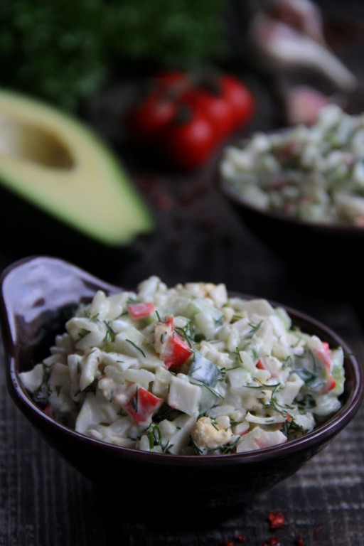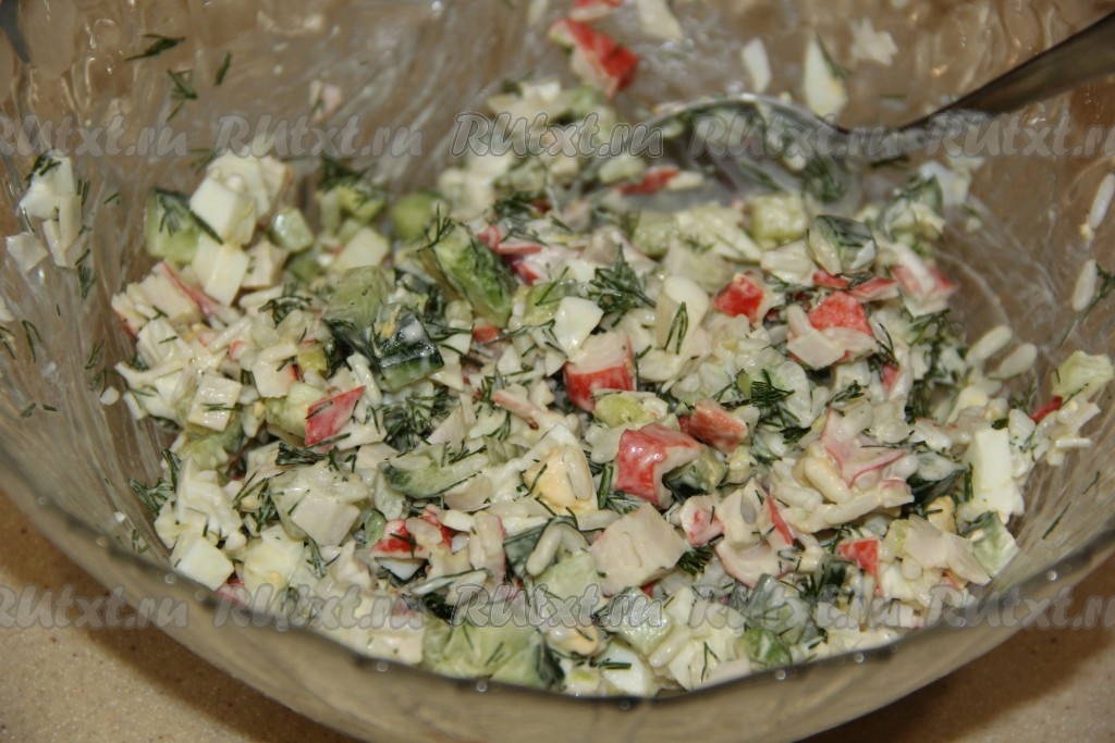 Салат, приготовленный с крабовыми палочками, свежим огурцом и рисом без добавления кукурузы, получается и вкусным, и достаточно сытным, и нежным, и очень аппетитным, попробуйте!