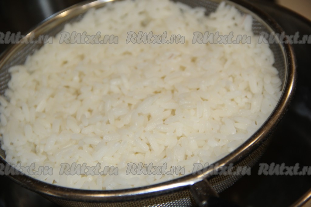 Откинуть готовый рис на сито, хорошо промыть холодной водой. Оставить рис в сите, чтобы он остыл и стекла лишняя жидкость. Рис получается рассыпчатым, он идеально подходит для приготовления салата. Для этого блюда нам потребуется 3-4 столовые ложки отваренного риса.