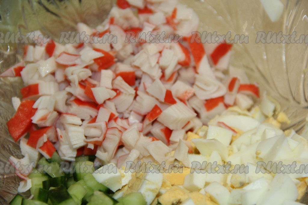 Разморозить крабовые палочки при комнатной температуре и мелко нарезать. В салатнике соединить нарезанные свежий огурец, крабовые палочки и варёные яйца.