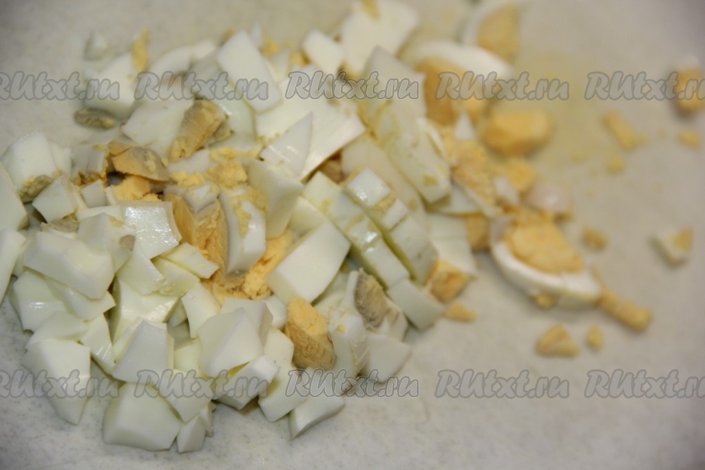 3 сваренных вкрутую яйца (варим, примерно, 10 минут с момента закипания) остудить, почистить, а затем нарезать их на мелкие кубики.