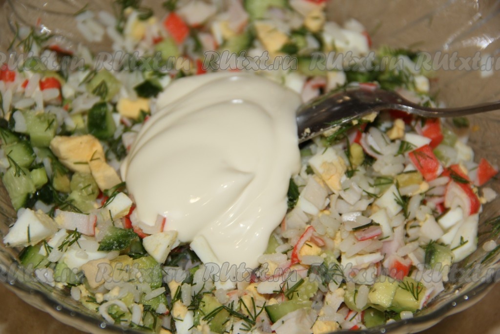 Сюда же выложить отваренный рис, вымытый и мелко нарезанный укроп, перемешать салат, заправить его майонезом, если понадобится, подсолить по вкусу.