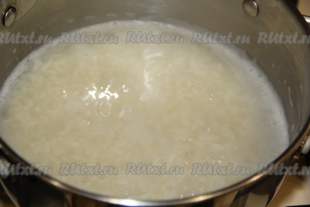 Рис тщательно промыть, выложить в кастрюлю, залить большим количеством воды. Поставить кастрюлю с рисом на огонь, после закипания воды варить на небольшом огне до готовности риса (обычно на это требуется с момента закипания минут 15-20).
