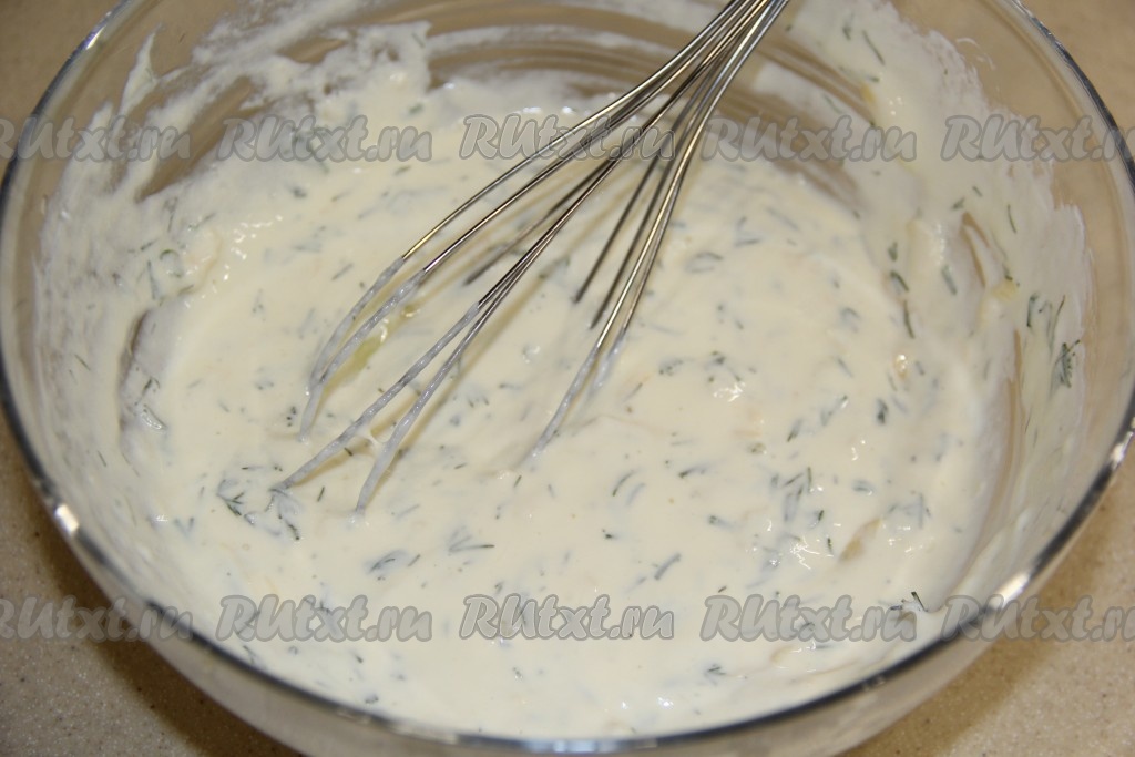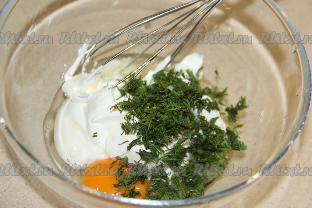 Для приготовления соуса соединить сметану и сырое яйцо, добавить пропущенный через пресс зубчик чеснока и мелко нарезанный укроп.