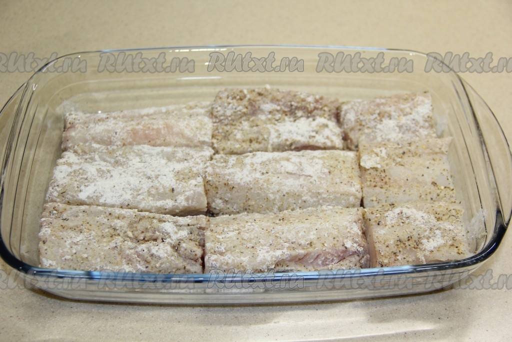 Обвалять кусочки филе трески со всех сторон в получившейся панировке. Выложить подготовленные кусочки в жаропрочную форму в один слой.