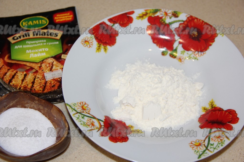 Сперва подготовим панировку, для этого в тарелке нужно соединить муку, специи и соль, перемешать.
