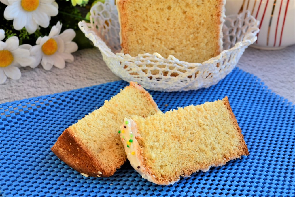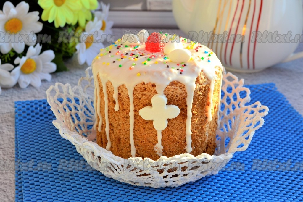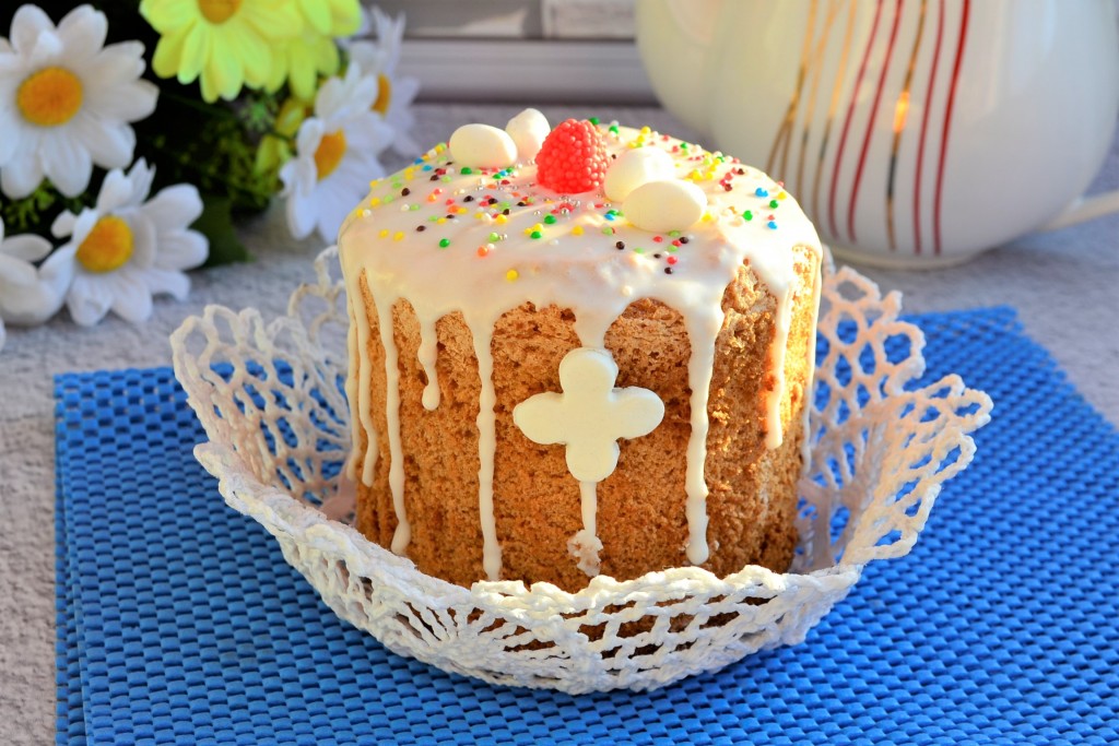 Такой выпечке нужно дать время для того, чтобы её можно было аккуратно разрезать, поэтому вкуснейший и нежнейший бисквитный кулич нужно завернуть в плёнку и оставить на 6-8 часов в холодильнике или при комнатной температуре, а затем развернуть, украсить глазурью и цветной посыпкой. Обязательно дать глазури застыть.