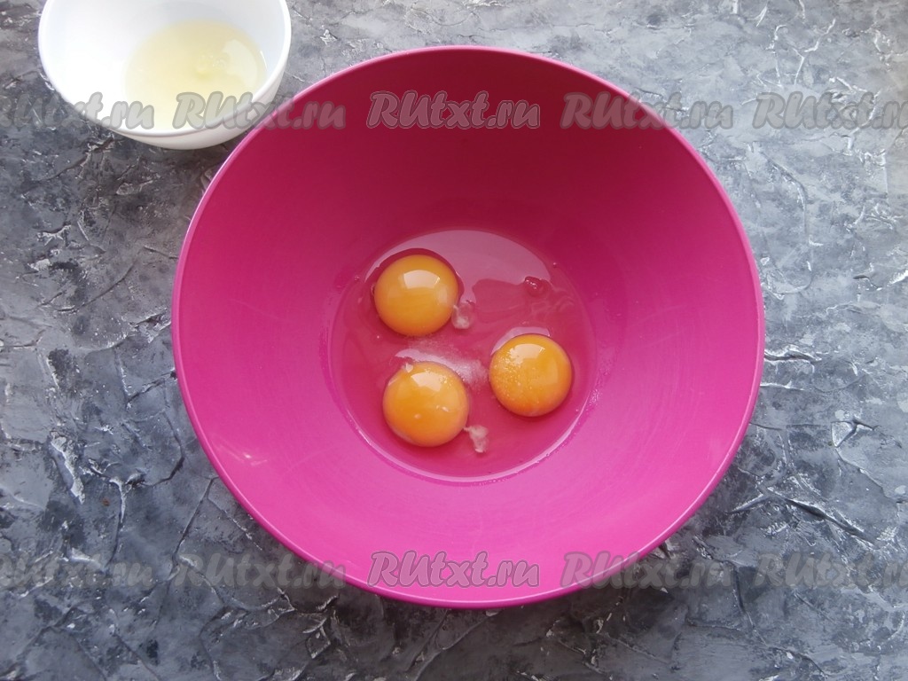 2 охлаждённых яйца и 1 яичный желток поместить в миску, всыпать щепотку соли.