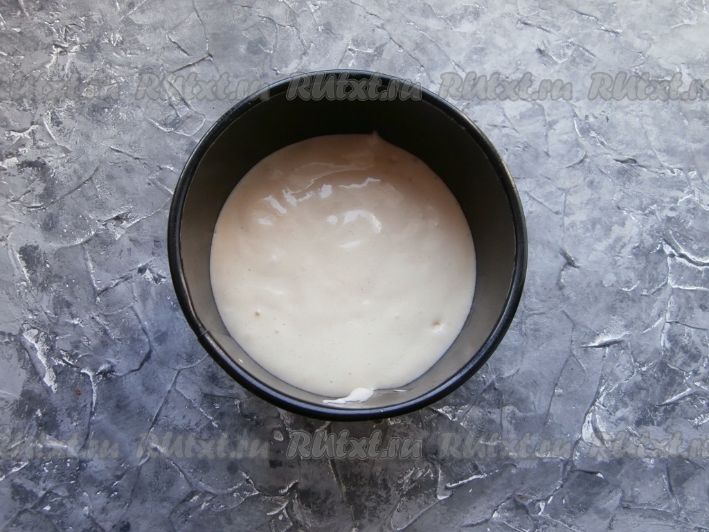 Дно разъёмной формы для кулича диаметром 13 см и высотой 12 см застелить пергаментом, выложить тесто. У меня оно заняло чуть больше половины объёма формы.