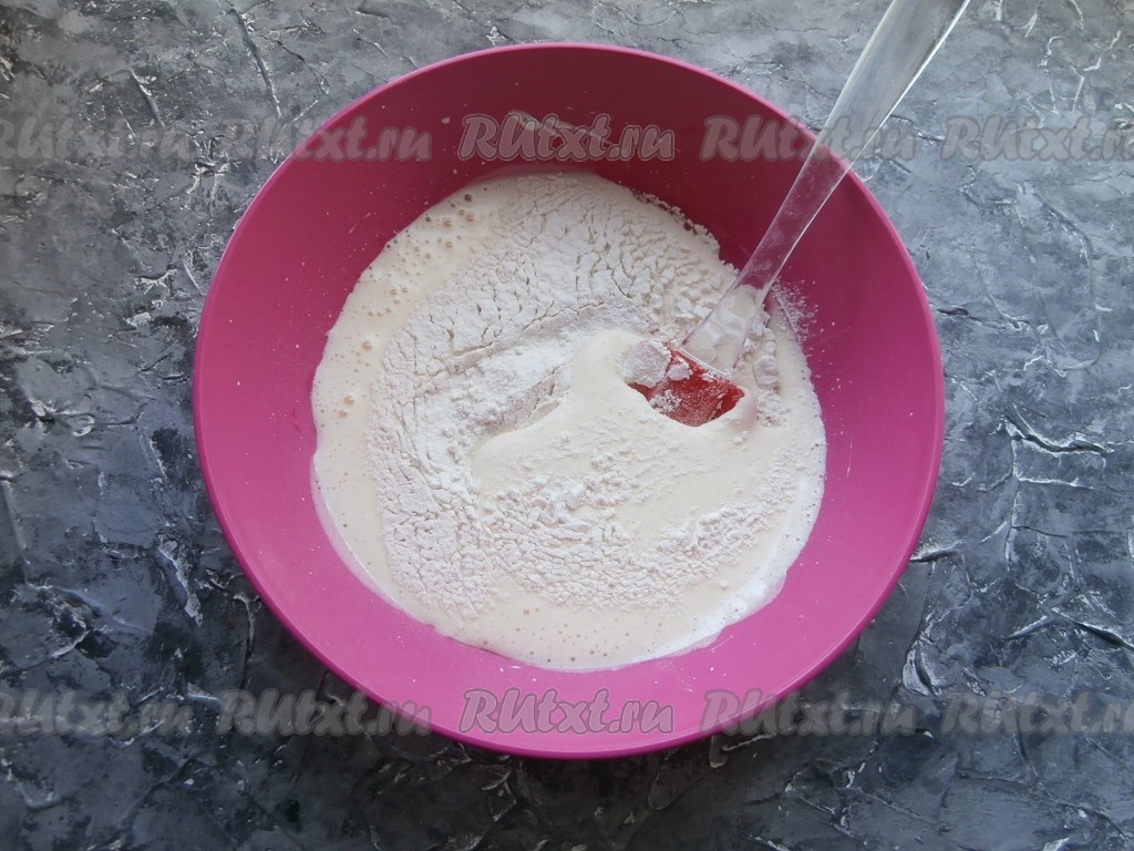 В получившуюся яичную смесь в 2 приёма просеять муку и разрыхлитель, каждый раз полностью вмешивая лопаткой движениями снизу вверх.
