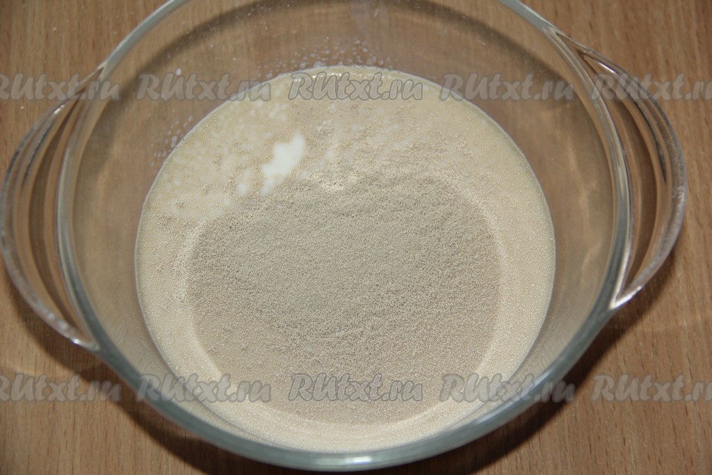 Для начала приготовим опару, для этого в молоко, подогретое, примерно, до 40 градусов, нужно всыпать сахар и дрожжи, перемешать.