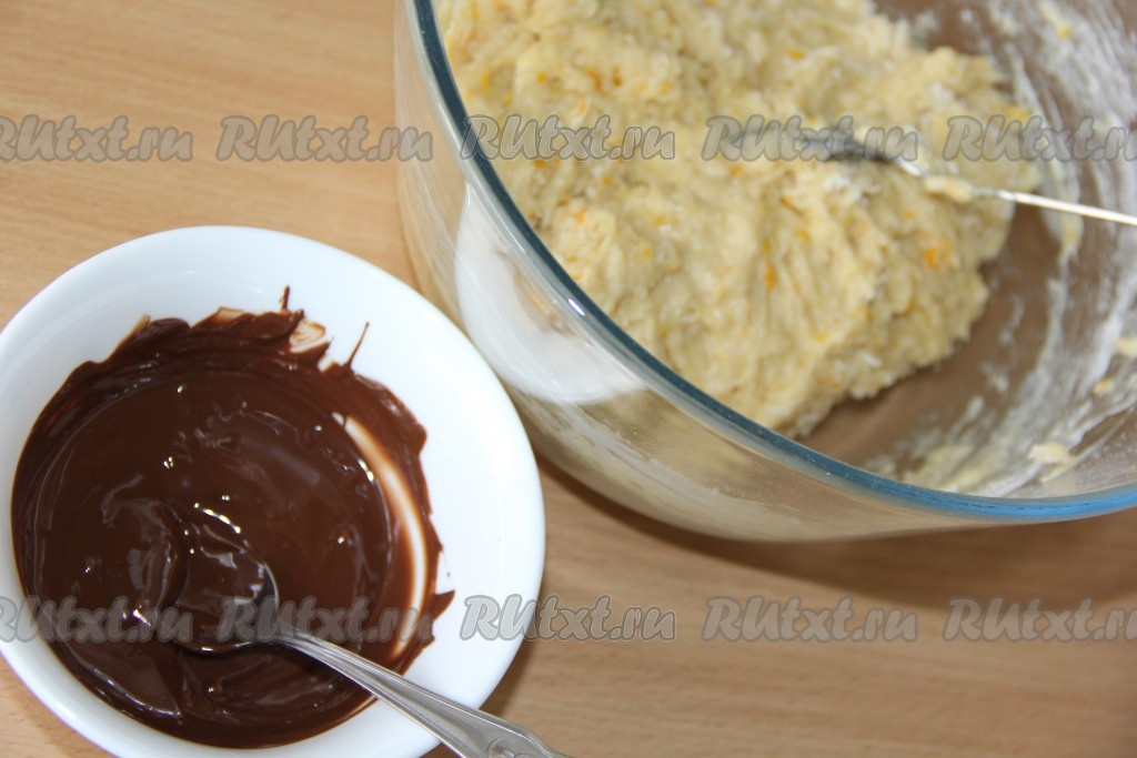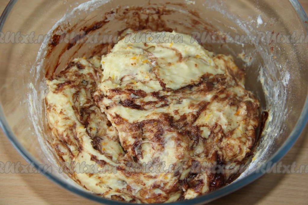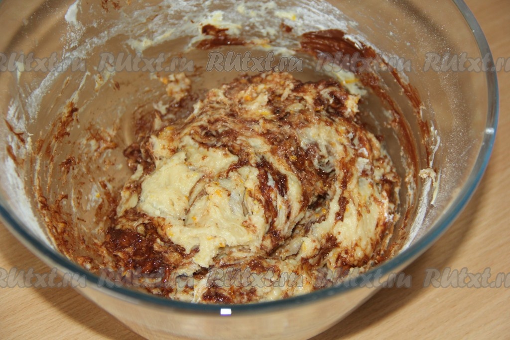 Аккуратно подмешивать шоколад в тесто с помощью ложки. Я просто протягивала шоколад в тесто, а не перемешивала. Тесто должно получиться мраморным, с шоколадными разводами (как на фото), оно не должно быть однородного цвета.