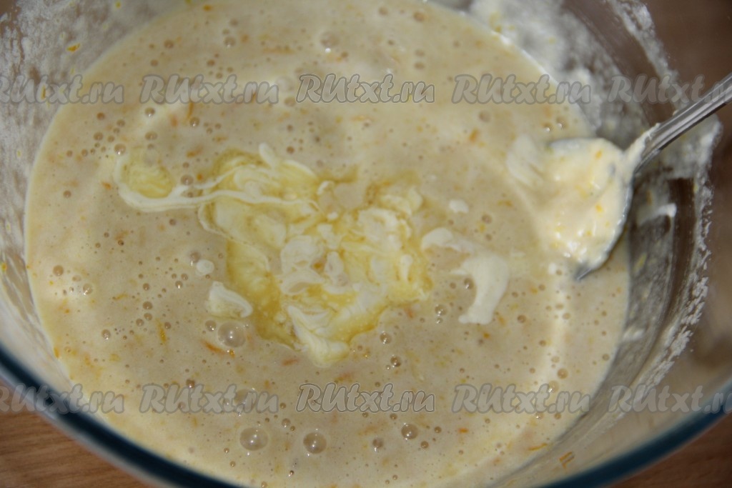 Сливочное масло слегка растопить, например, в микроволновке (или заранее достать его, чтобы оно полежало при комнатной температуре и хорошо размягчилось). Не горячее масло добавить в тесто, перемешать.