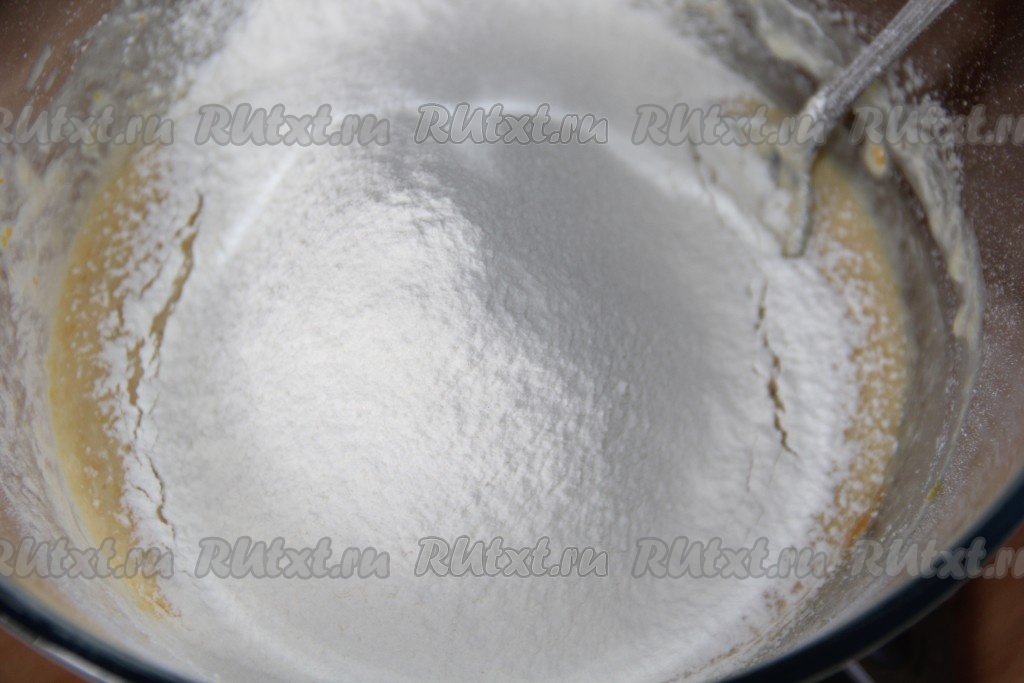 Всыпать ванилин, просеянную муку и перемешать тесто ложкой (или лопаткой).