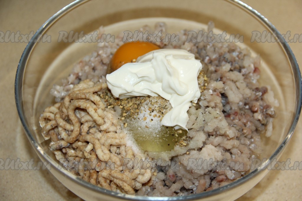 К рыбному фаршу, хлебу и луку добавить яйцо, соль, специи и сметану.