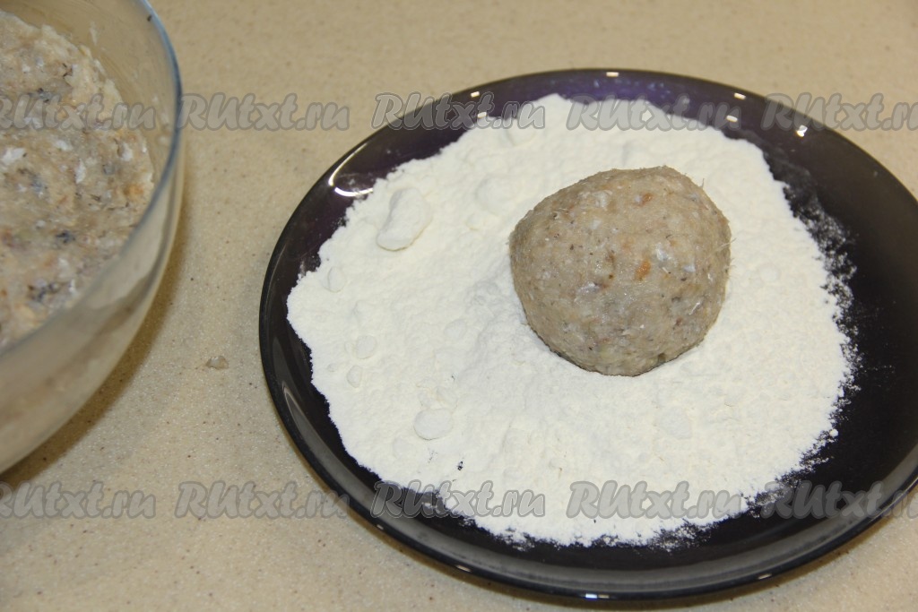Из рыбного фарша сформировать котлеты любой формы и обвалять их со всех сторон в муке (вместо муки можно обвалять котлеты в панировочных сухарях или манке).