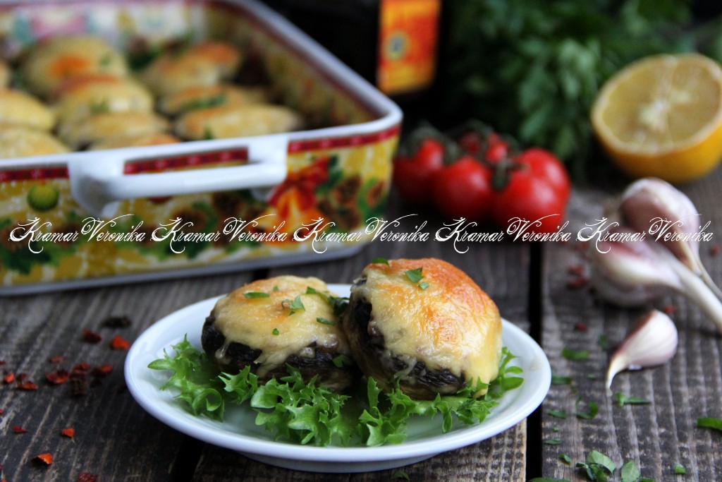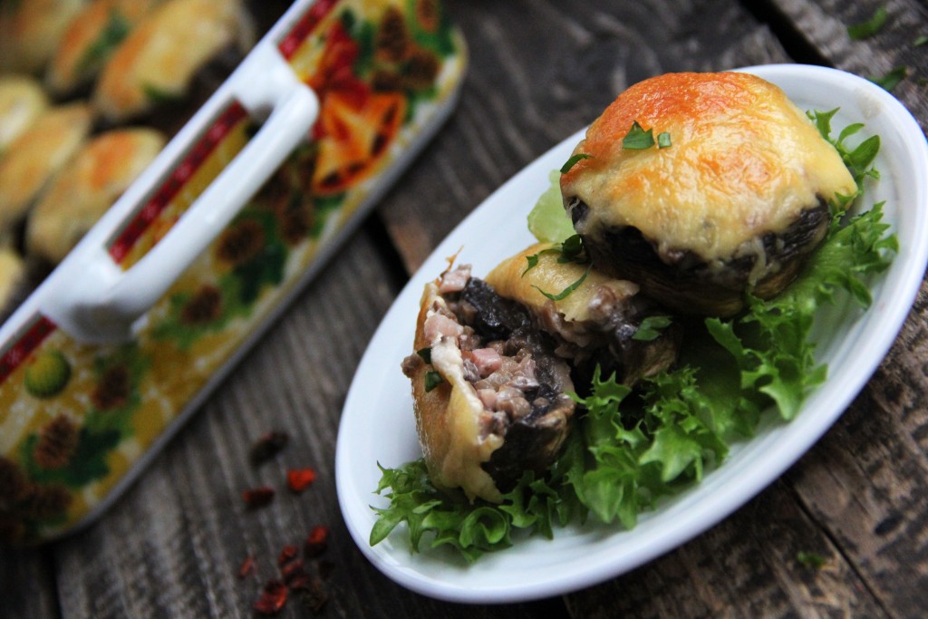 Форму с шляпками шампиньонов, фаршированными ветчиной и сыром, достать из духовки, переложить на тарелку и сразу подать к столу. Такая вкусная и сочная горячая закуска станет украшением стола и в будни, и в праздники!