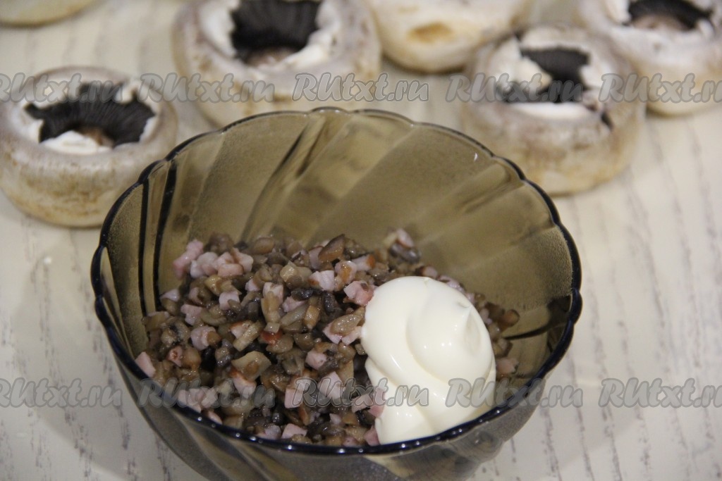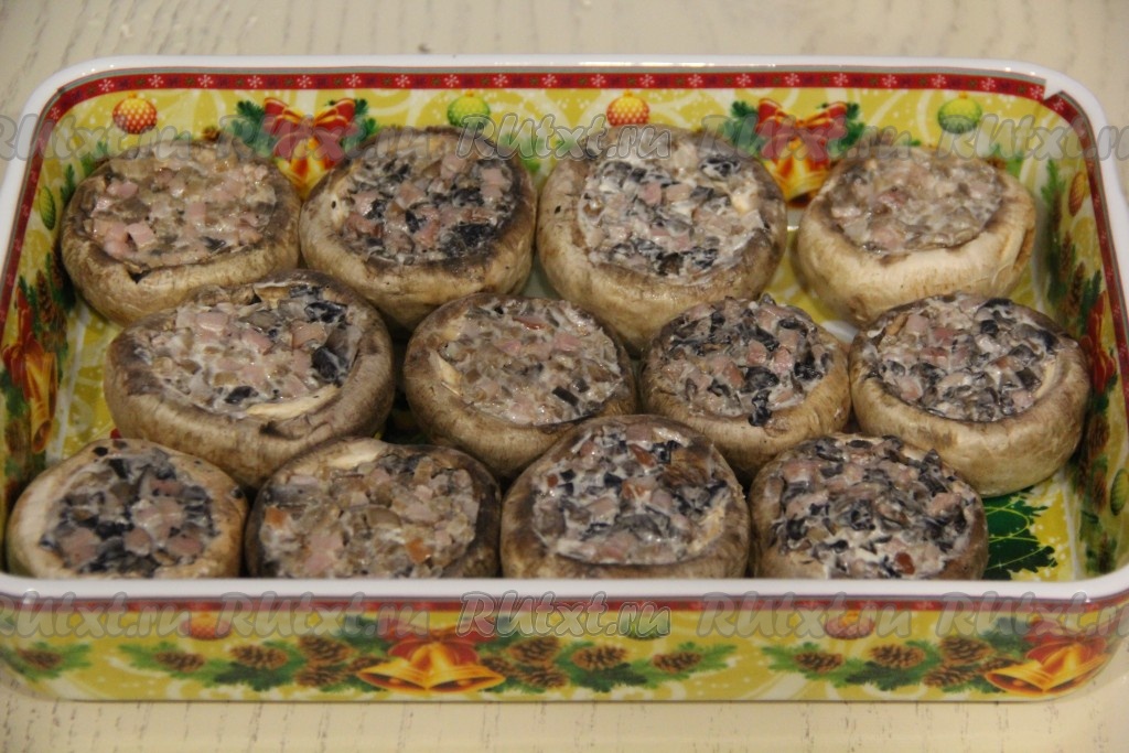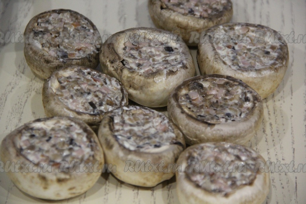 Выложить начинку в шляпки шампиньонов и утрамбовать.
