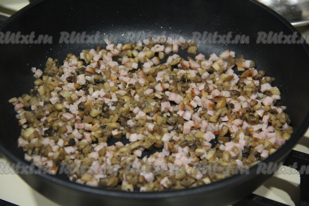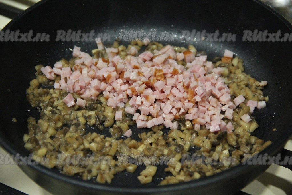 Затем в сковороду к обжаренным ножкам шампиньонов выложить ветчину, нарезанную на мелкие кубики, хорошо перемешать.