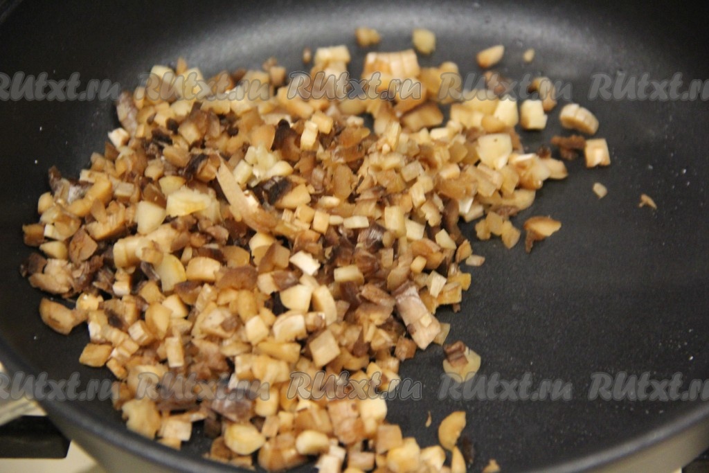 Обжарить пару минут, периодически перемешивая. В конце посолить, поперчить, снять начинку с огня и дать немного остыть, переложить в миску.