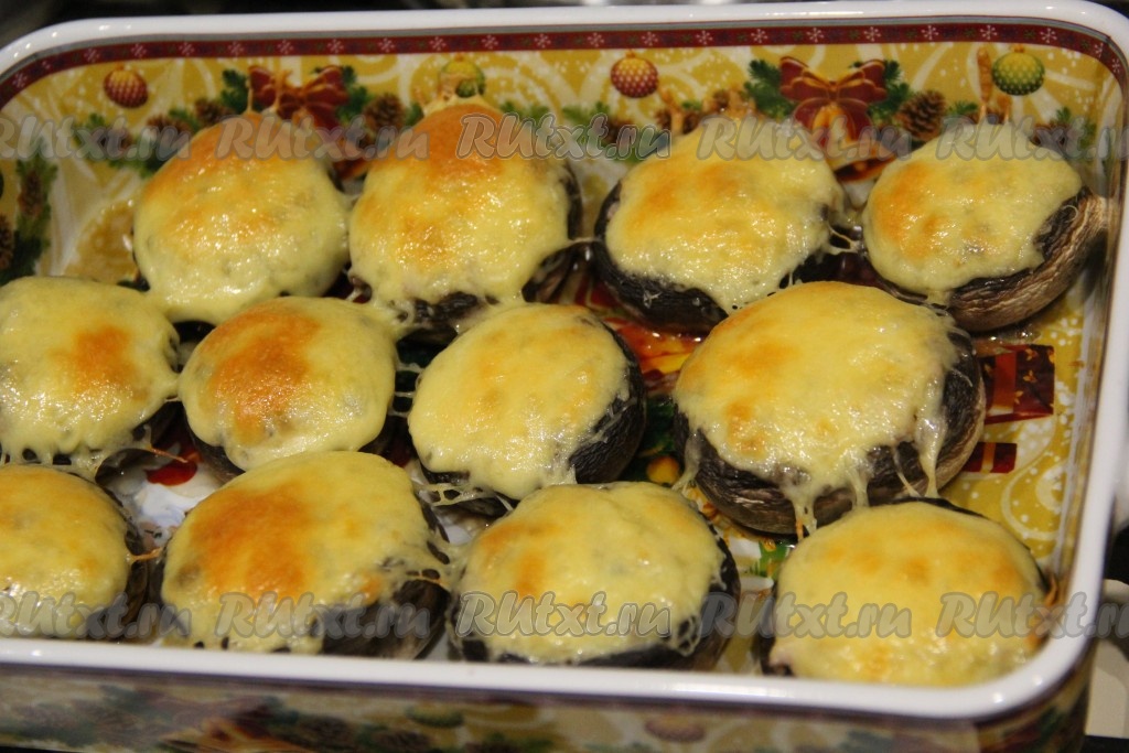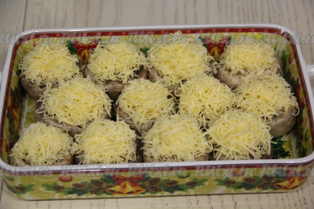 Поверх каждой фаршированной шляпки выложить сыр, натёртый на мелкой тёрке.