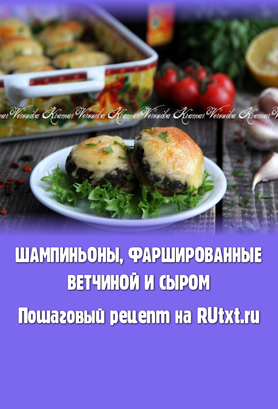 Шампиньоны, фаршированные ветчиной и сыром, запекать минут 10 в духовке, разогретой до 200 градусов.