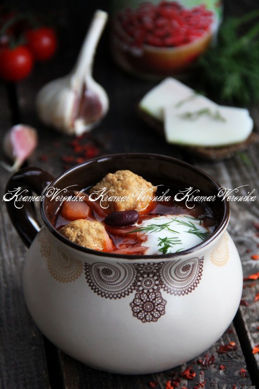 Вкусный, сытный, насыщенный сибирский борщ с фрикадельками и фасолью подать к столу со сметаной и зеленью.