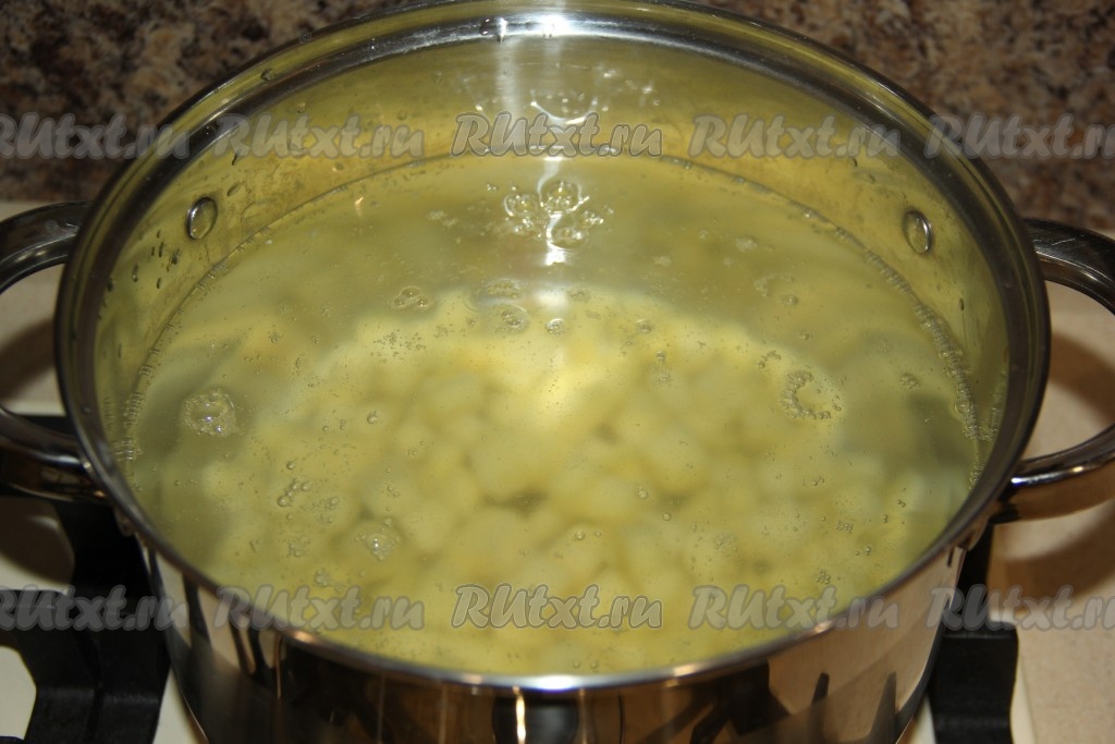 В кастрюлю влить 3 литра воды и довести до кипения. Картофель почистить и нарезать на кубики. Опустить картофель в кипящую воду.