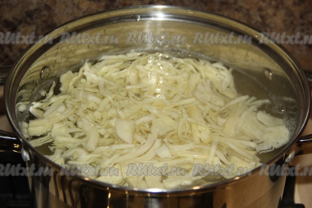 Капусту нашинковать и сразу добавить в кастрюлю, дать закипеть и сделать огонь умеренным.
