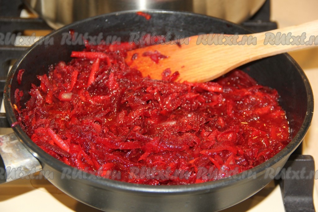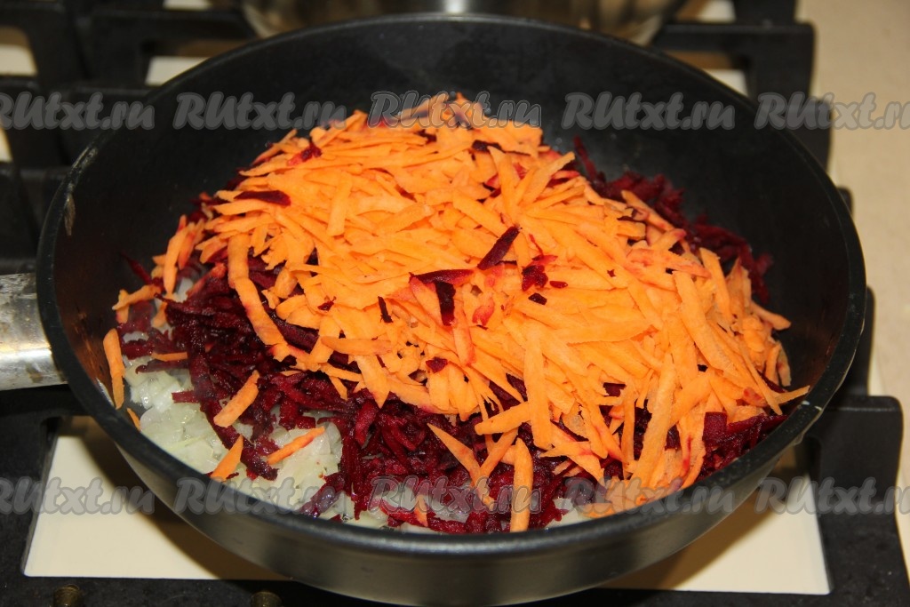 Морковь и свеклу почистить, натереть на тёрке и выложить к обжаренному луку.