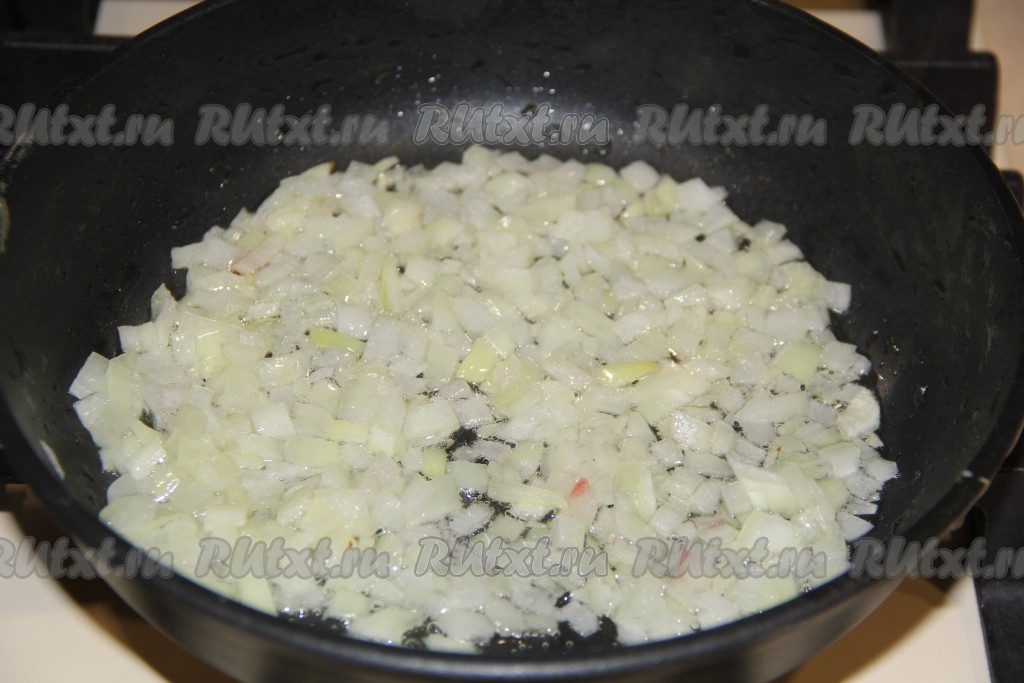 Пока суп варится, приготовить зажарку. Лук почистить и нарезать на кубики. В сковороду влить масло и добавить лук, обжарить, иногда перемешивая, в течение 3-5 минут на среднем огне.