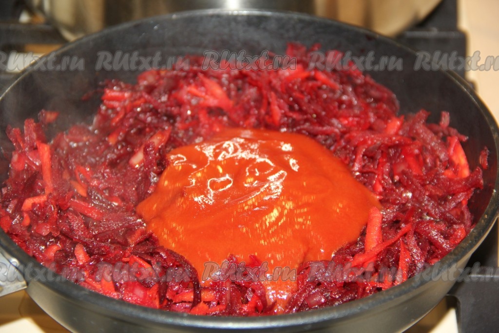 Влить немного бульона из супа и тушить овощи 10 минут под крышкой на небольшом огне. Затем положить в овощную зажарку томатную пасту.