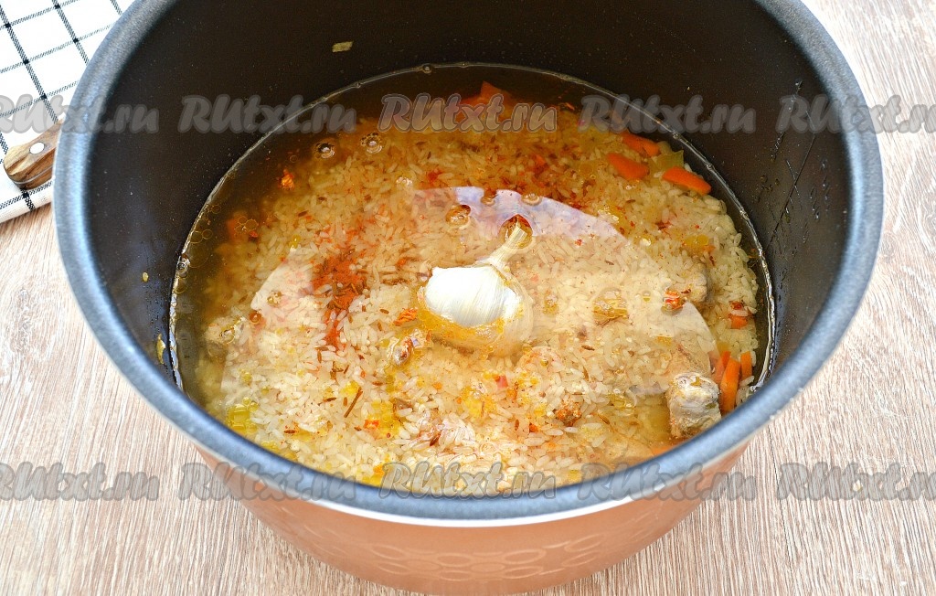 Аккуратно влить кипячёную воду. Старайтесь, чтобы рис не перемешался с мясом. В середину воткнуть головку чеснока в кожуре (у меня была только половинка).