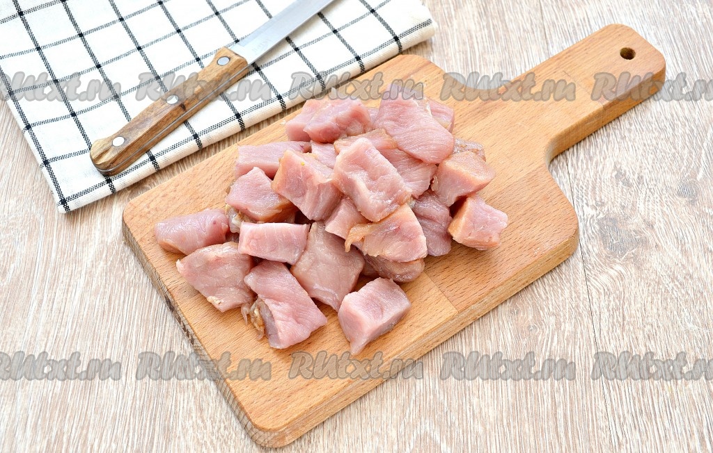 Свинину промыть, обсушить, нарезать на средние кусочки и выложить к обжаренным овощам.