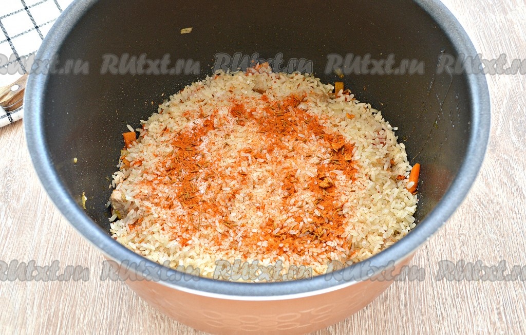 Рис промыть, слить воду. Выложить промытый рис ровным слоем поверх свинины и овощей.