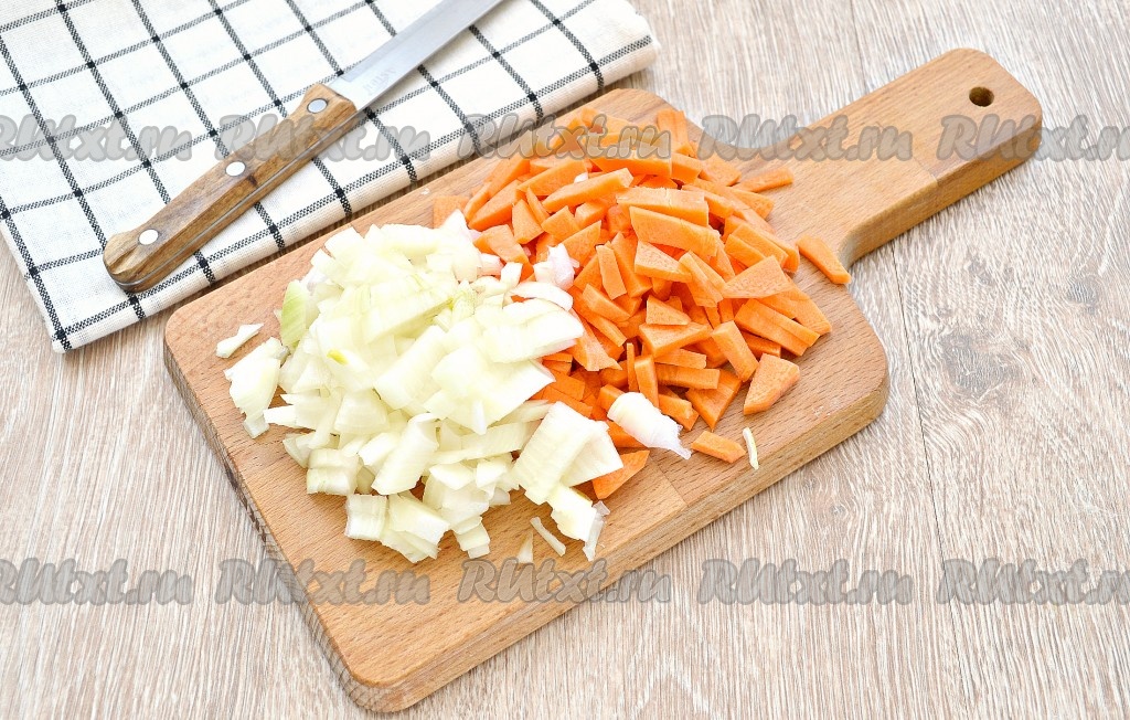 Очистить морковь и луковицу, с головки чеснока снять только верхнюю шелуху. Морковку нарезать небольшими брусочками, лук - на небольшие кубики. В чашу мультиварки влить растительное масло. Включить режим «Жарка». Выложить нарезанные морковку и лук, обжаривать, периодически помешивая, не закрывая крышку, 5 минут.