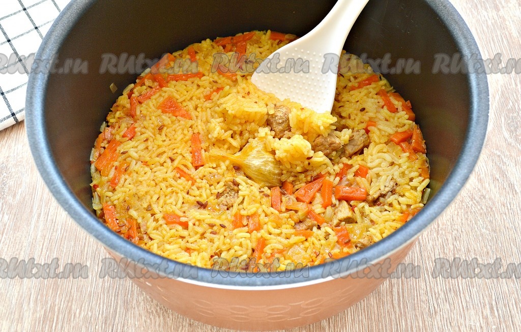 Заменить программу «Жарка» программой «Плов», закрыть крышку мультиварки. Готовить плов со свининой 40 минут (до окончания программы). Если нет программы "Плов", можно готовить также на программах «Выпечка» или «Тушение» в течение 40 минут. После приготовления крышку сразу не открывать, дать плову потомиться 10 минут в автоматическом режиме на программе «Подогрев».