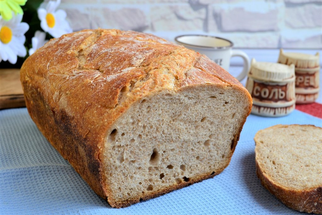 Бездрожжевой хлебушек поместить на решётку и дать полностью остыть. После этого невероятно вкусный, с хрустящей корочкой пшеничный цельнозерновой хлеб, приготовленный на ржаной закваске, можно нарезать и подать в качестве дополнения к различным блюдам.