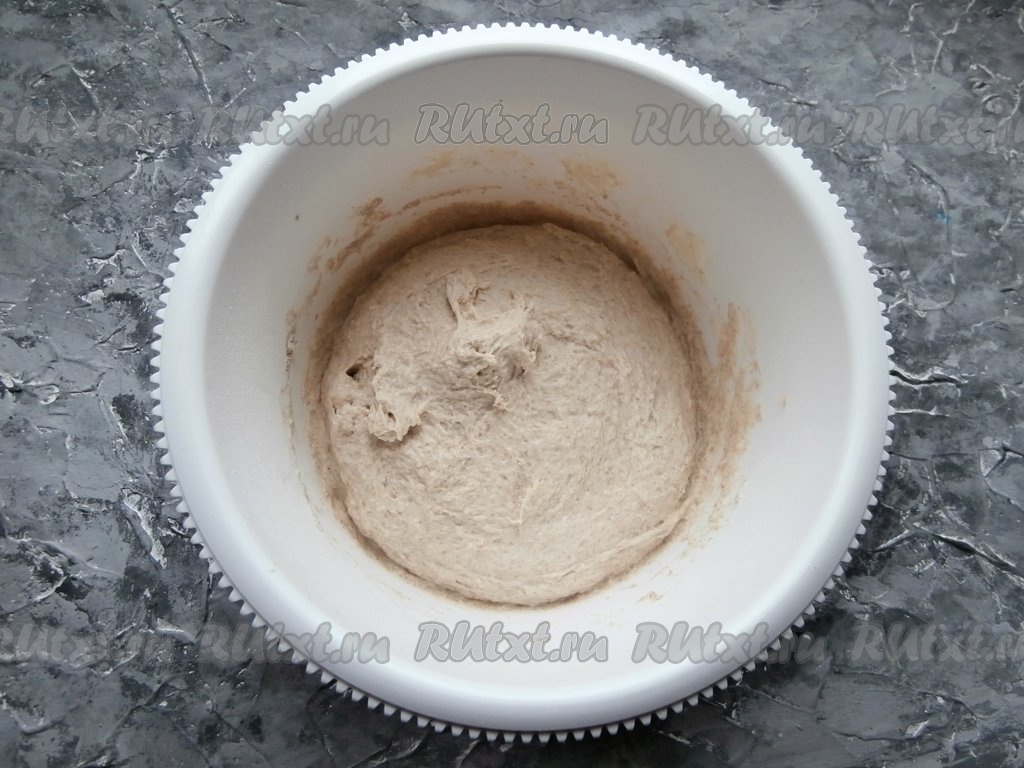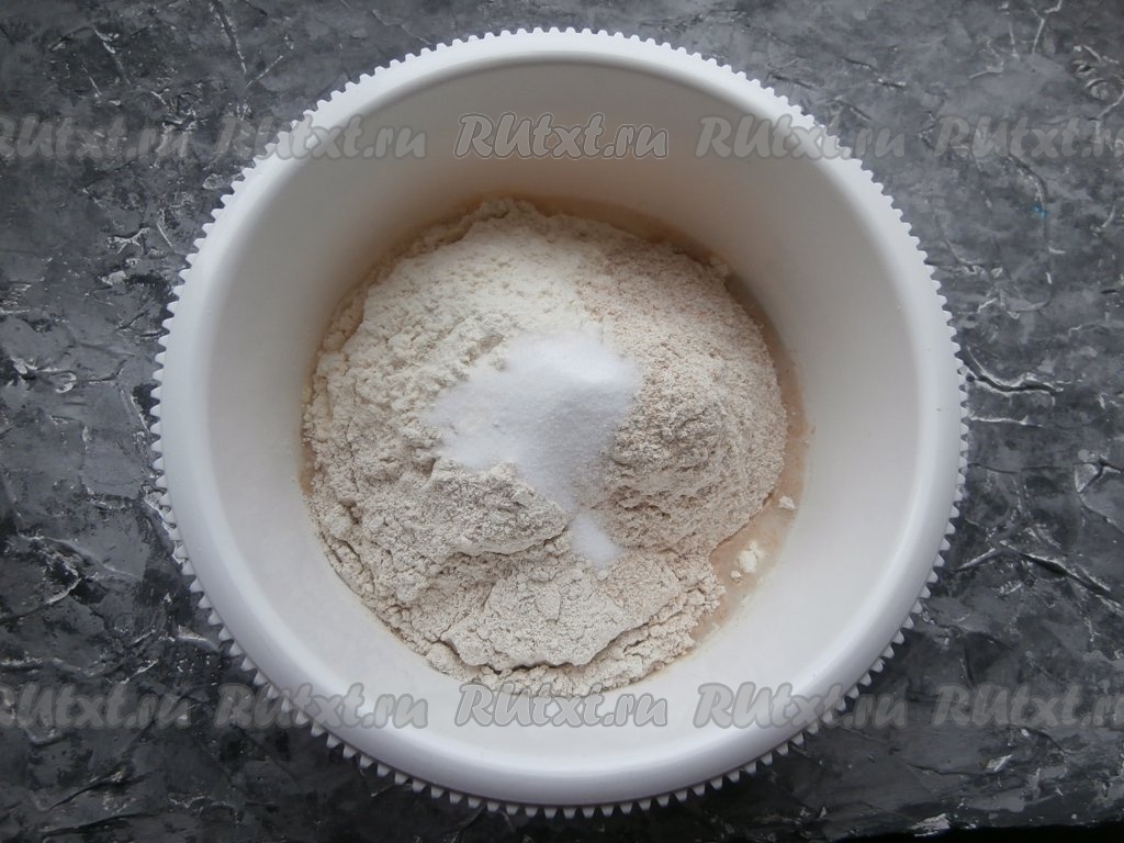 Хорошенько перемешать, всыпать пшеничную, ржаную и цельнозерновую муку.