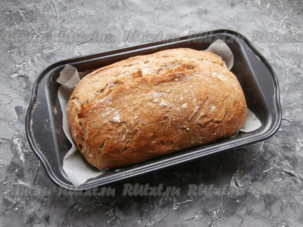 Поместить форму в разогретую духовку и выпекать с фольгой 20-25 минут. Затем фольгу убрать, температуру снизить до 210-220 градусов и печь пшеничный цельнозерновой хлеб дальше ещё 20-25 минут. Хлебушек должен очень хорошо зарумяниться.