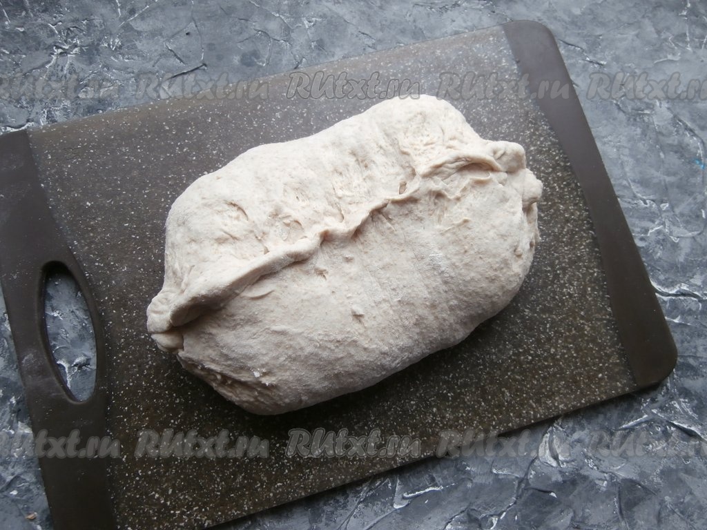Накрыть чашу с тестом плёнкой и оставить его в тёплом месте на 6-7 часов. В течение этого времени 4 раза тесто нужно вытягивать влажной рукой и складывать к середине (обминать). После этого тесто выложить на стол, посыпанный мукой, растянуть в пласт и сложить конвертом, защипывая края вверху.