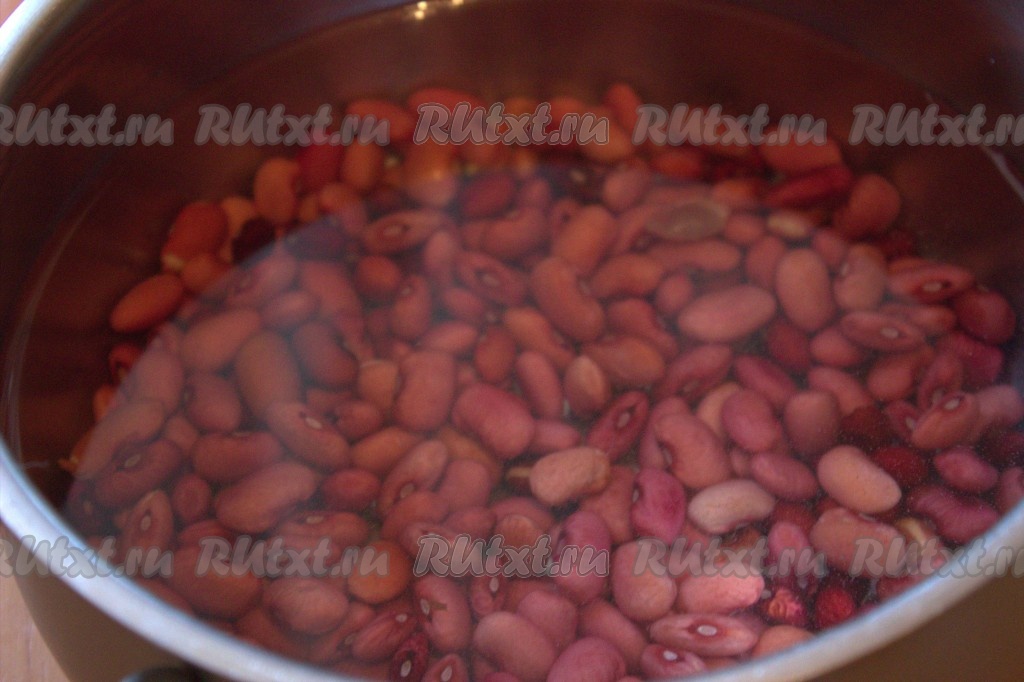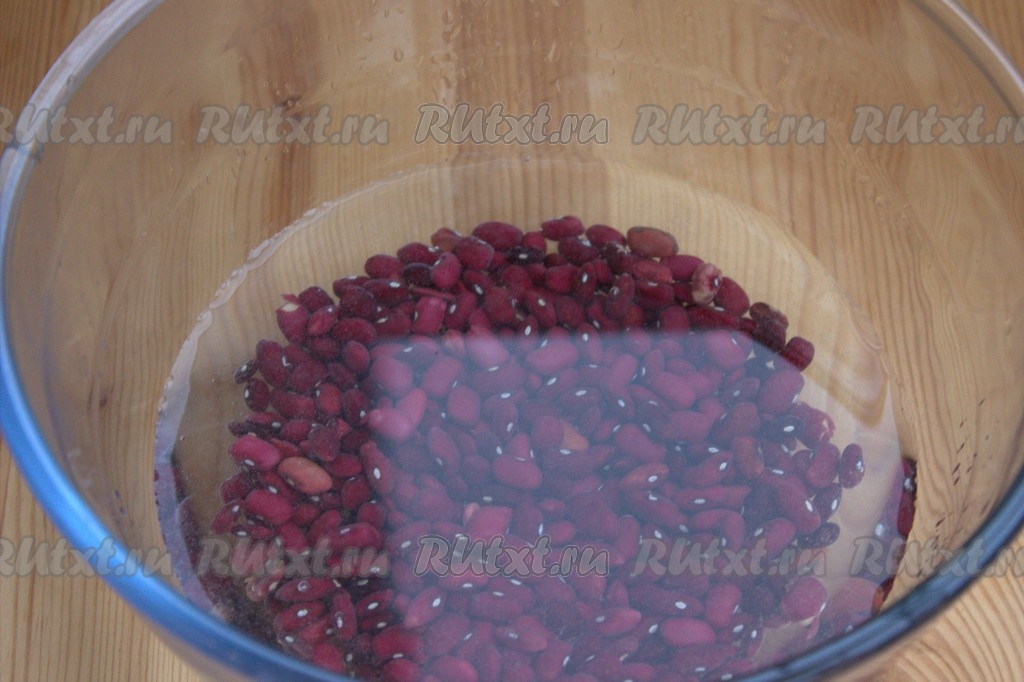 Сухую красную фасоль промыть под проточной водой, выложить в миску, полностью залить холодной водой и оставить часов на 10 (лучше оставить на ночь).