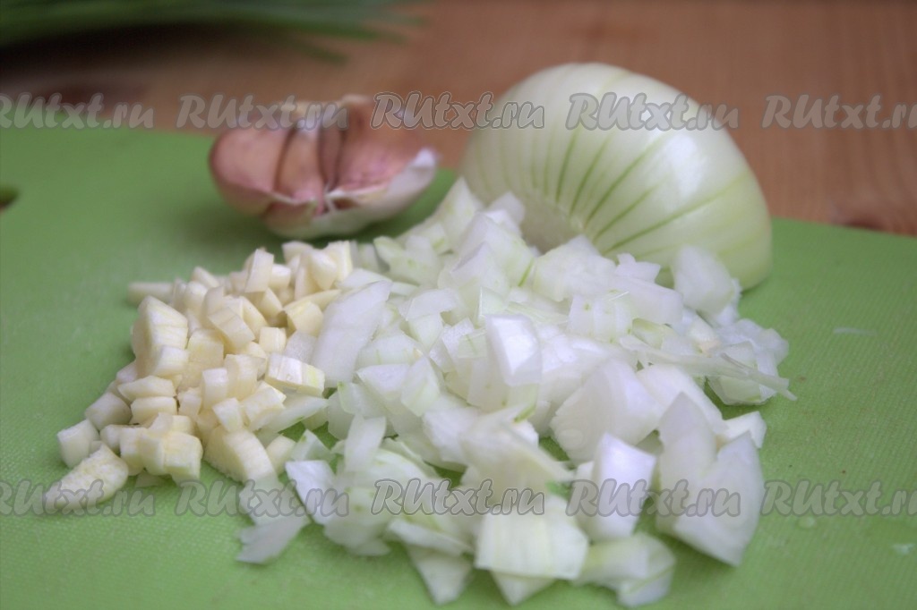Очищенную луковицу и очищенный чеснок нарезать на мелкие кубики.