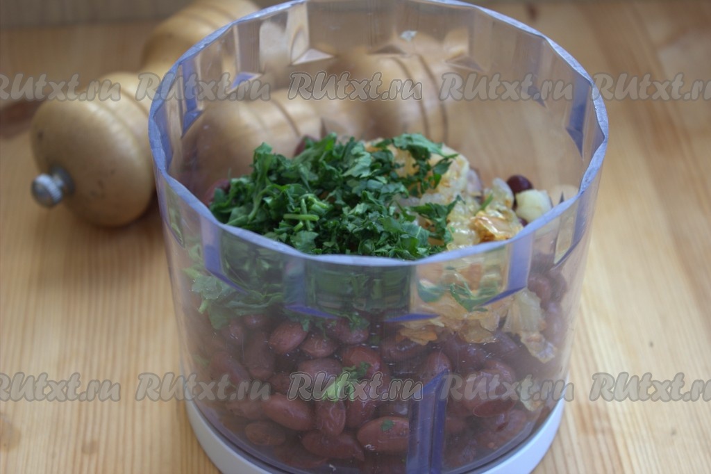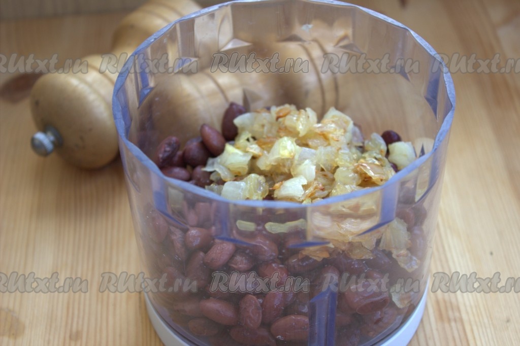 Остывшие фасоль, обжаренные лук и чеснок поместить в измельчитель (если нет измельчителя, можно пропустить несколько раз через мясорубку).